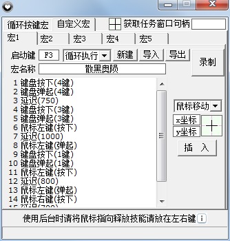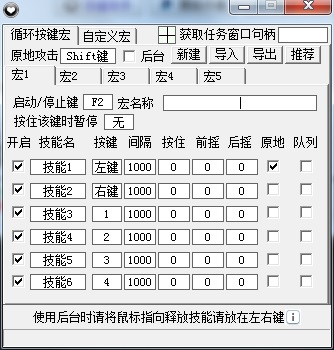 1.宏1~宏5分别为5个独立的宏,每个可相互独立运行,但必须设置不同的启动/停止键,每个宏的所有技能均会同时进行循环操作