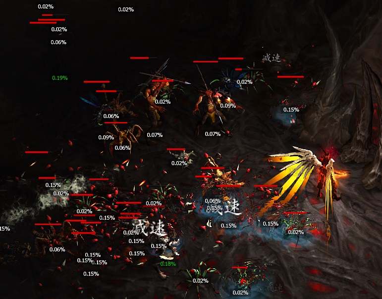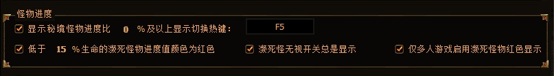 可自行设置是否要在多人游戏时显示低于特定生命值的怪物进度值显示为红色,方便提醒优先击杀,主要是用于死灵法师诅咒斩杀效果
