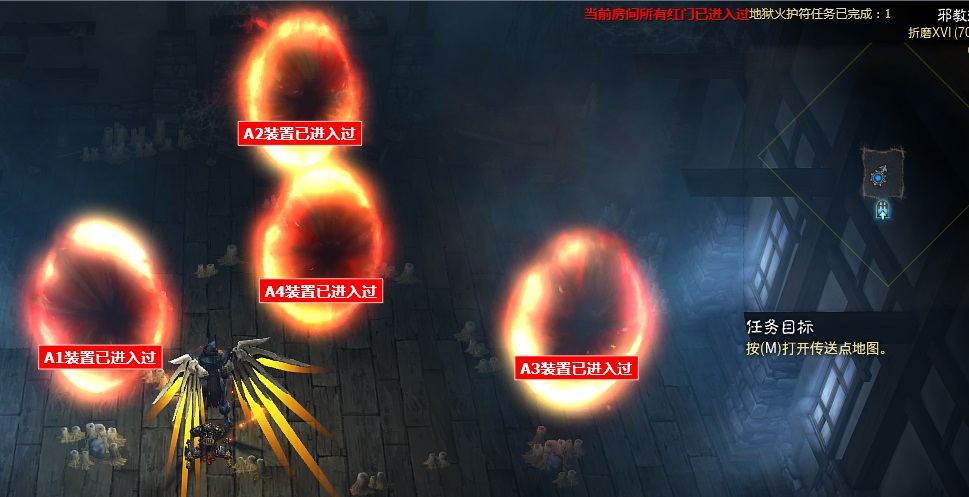 当打完本房间所有红门之后,右上角地图上方会显示相关的提示以及记录已经完成地狱火护符任务的次数