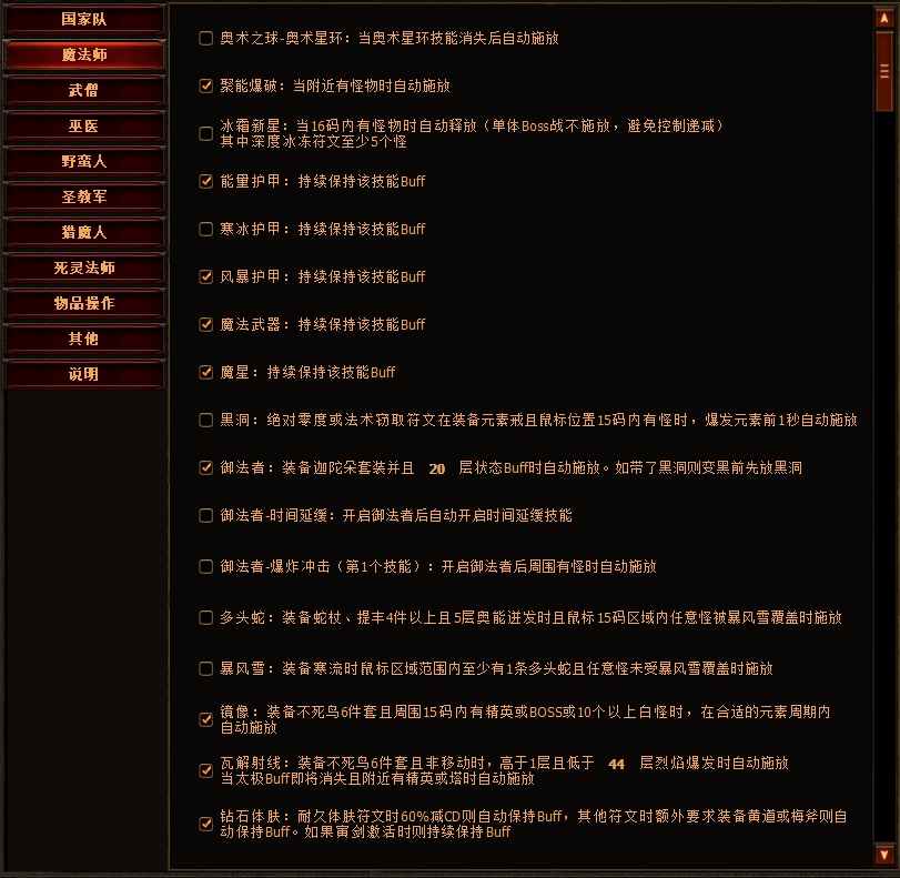 雷电宏中包含各职业的技能宏,此类宏只需要勾选后重启插件即可使之生效,大多数并不需要快捷键启动或停止,它会根据内置编写的条件逻辑自动判断施放时机,只要条件合理,绝对比人操作更精确和智能