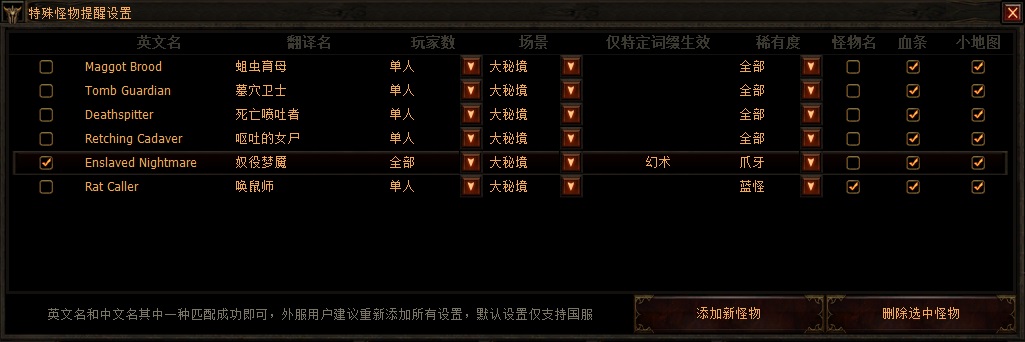 该插件可以自行添加需要特别注意的特殊怪物,默认添加的怪物为国服需要特别注意的招小怪的怪物,适用于大部分玩家(需要勾选开启)