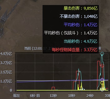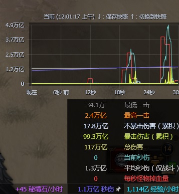 伤害统计:该插件可以记录总伤害,平均伤害等数据以及绘制最近30秒的伤害曲线图,并且支持鼠标悬停曲线图显示详细数据。该功能支持在游戏时按↓键保存当前30秒记录的伤害曲线快照,可通过按↑切换快照和当前的伤害曲线以便分析伤害数据