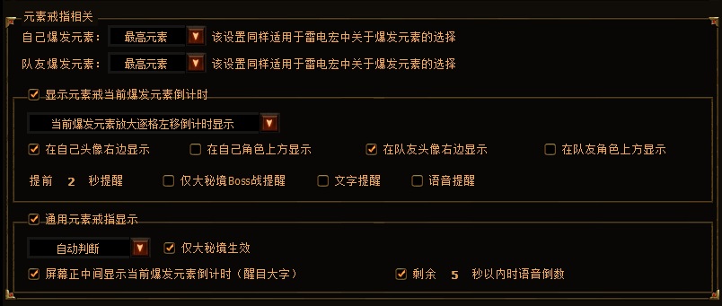 该插件可以监视元素戒指(全能法戒、元素嘉年华)的最高元素的倒计时,可以设置提前指定描述提醒,可选择文字或者语音提醒,提醒功能在城镇内不生效。